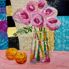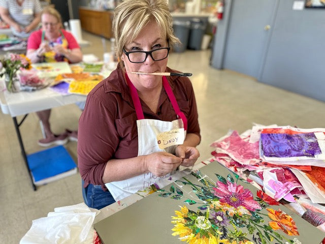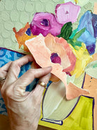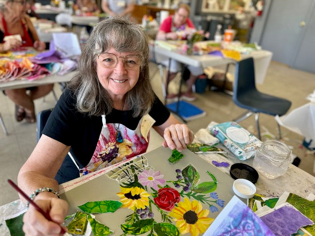 NEW! This new series of fun, funky floral pieces has been super popular on social media. Learn to create whimsical mixed media flowers in vessels on a background full of patterns. Incorporate acrylic paint, metallic leaf, stencils, and your own gel printed collage papers into a colorful, bright, piece of artwork.