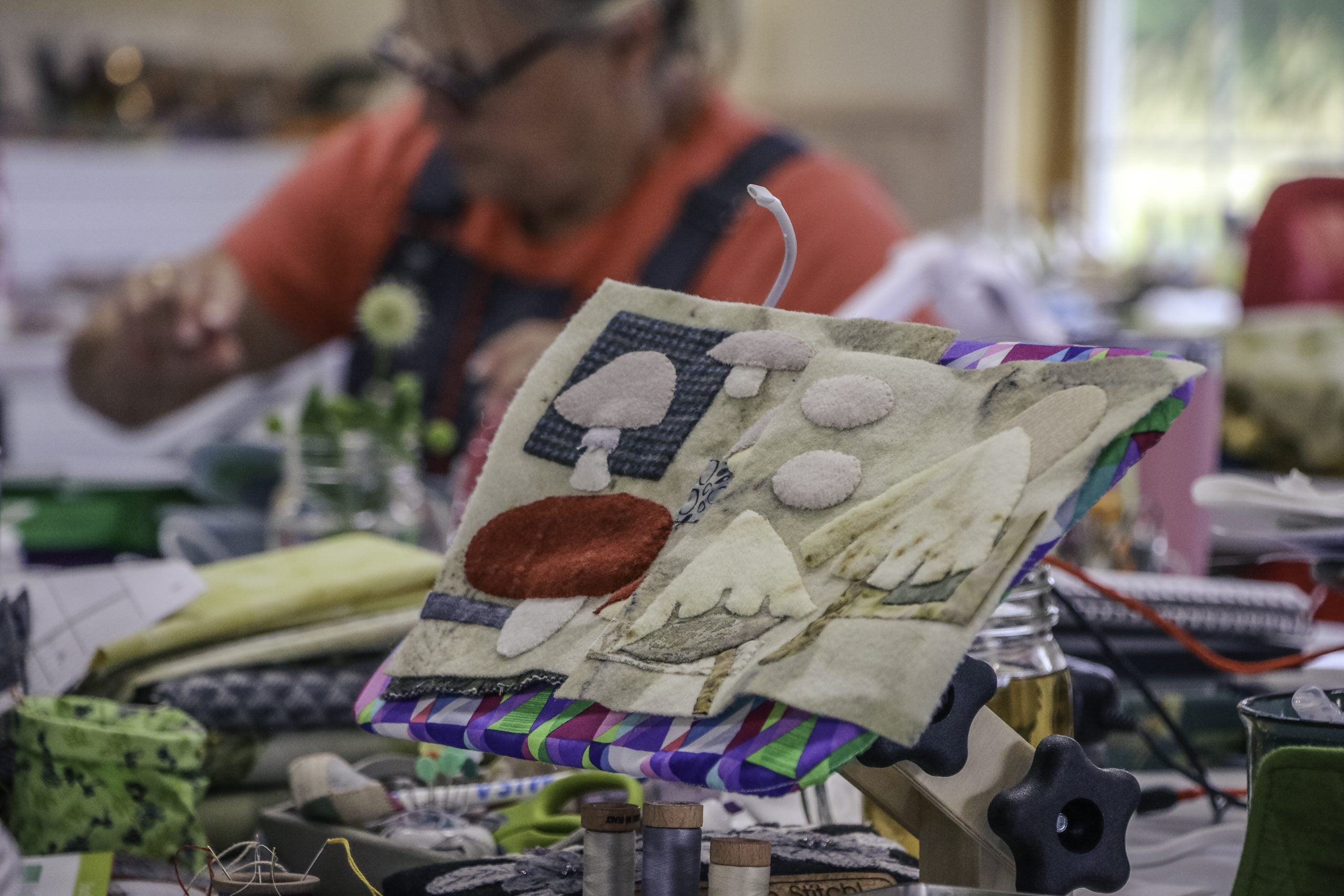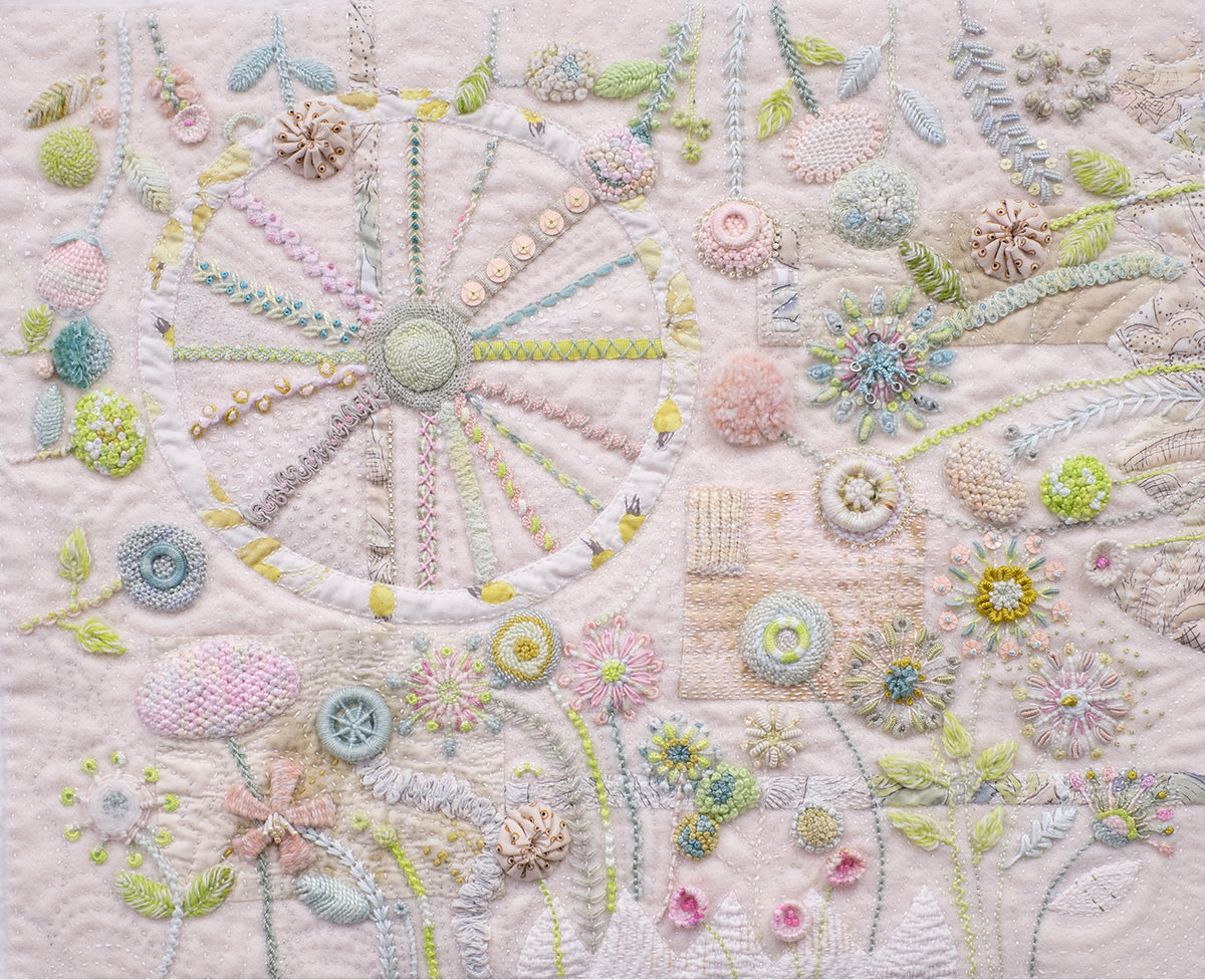 Focusing on the stitches, you will begin with a tonal layered wool and cotton background- perhaps in a pastel palette or in eco-prints. Sue will then offer her expertise on placing and layering stitches to add a unique layer of texture over your chosen textiles.