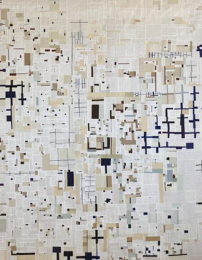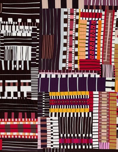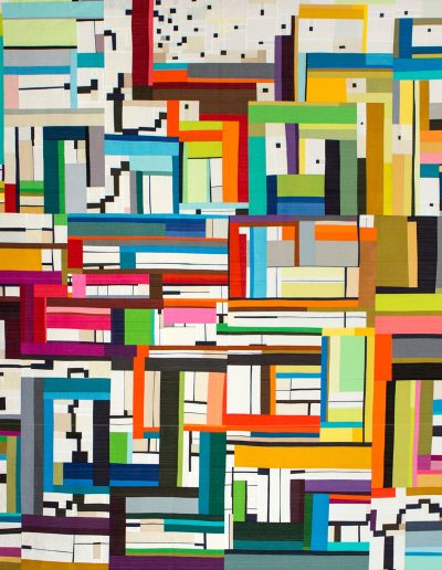 Lapham is an abstract textile artist who dances between the design wall and sewing machine. She is inspired by her unusual childhood crossing five continents, learning three languages, and managing four brothers. She taught herself to sew by making a gingham dress for herself at age 9. She went on to make a trip around the world quilt for each of her brothers during high school. Her vibrant, geometric, and exquisitely colored work has been exhibited widely in museums and exhibits such as the Virginia Museum of Contemporary Art, The Dairy Barn, Schweinfurth Museum, Visions and the Philadelphia Museum of Art. Her quilts are in private collections as well as the International Quilt Museum and she has received awards for piecing from QuiltCon and Quilts=Art=Quilts. She occasionally lectures on her improvisational approach to quiltmaking and is a mentor to modern quilters seeking to improv their practice and exhibit their work. She received degrees in cartography and statistics and worked as a mapmaker and researcher until her retirement in 2023. She spends her creative time in her studio in Vienna, Virginia.