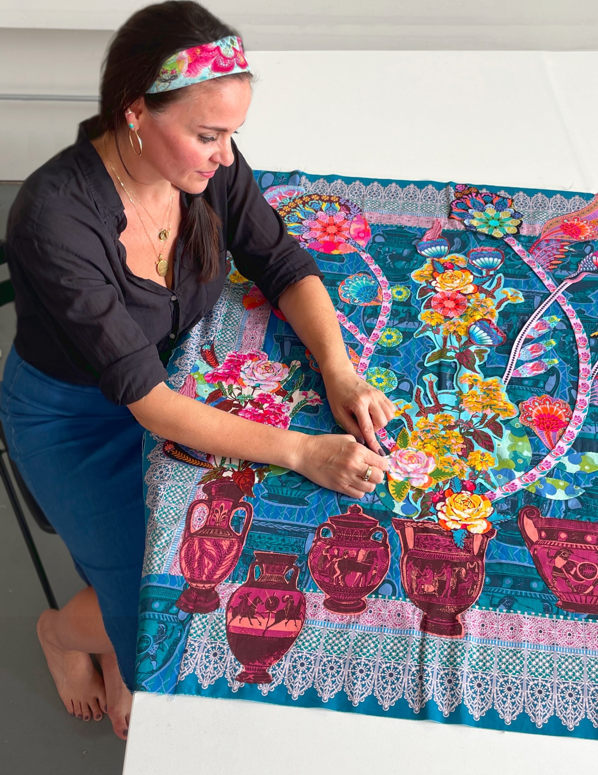 Traveling and sharing her creative point of view through lectures and workshops that focus on design, stitching and patchwork has become an increasingly important part of her work. Presenting her distinctively exuberant quilts and her self-taught process has taken her all over the world and keeps her passion for making alive. Anna Maria is the mother of seven children and all of her big and little ideas have been sparked in the presence of her family. Anna Maria shares the imperfect adventures of art making, quilting, gardening, mothering, traveling and home renovating on her instagram account @annamariahorner