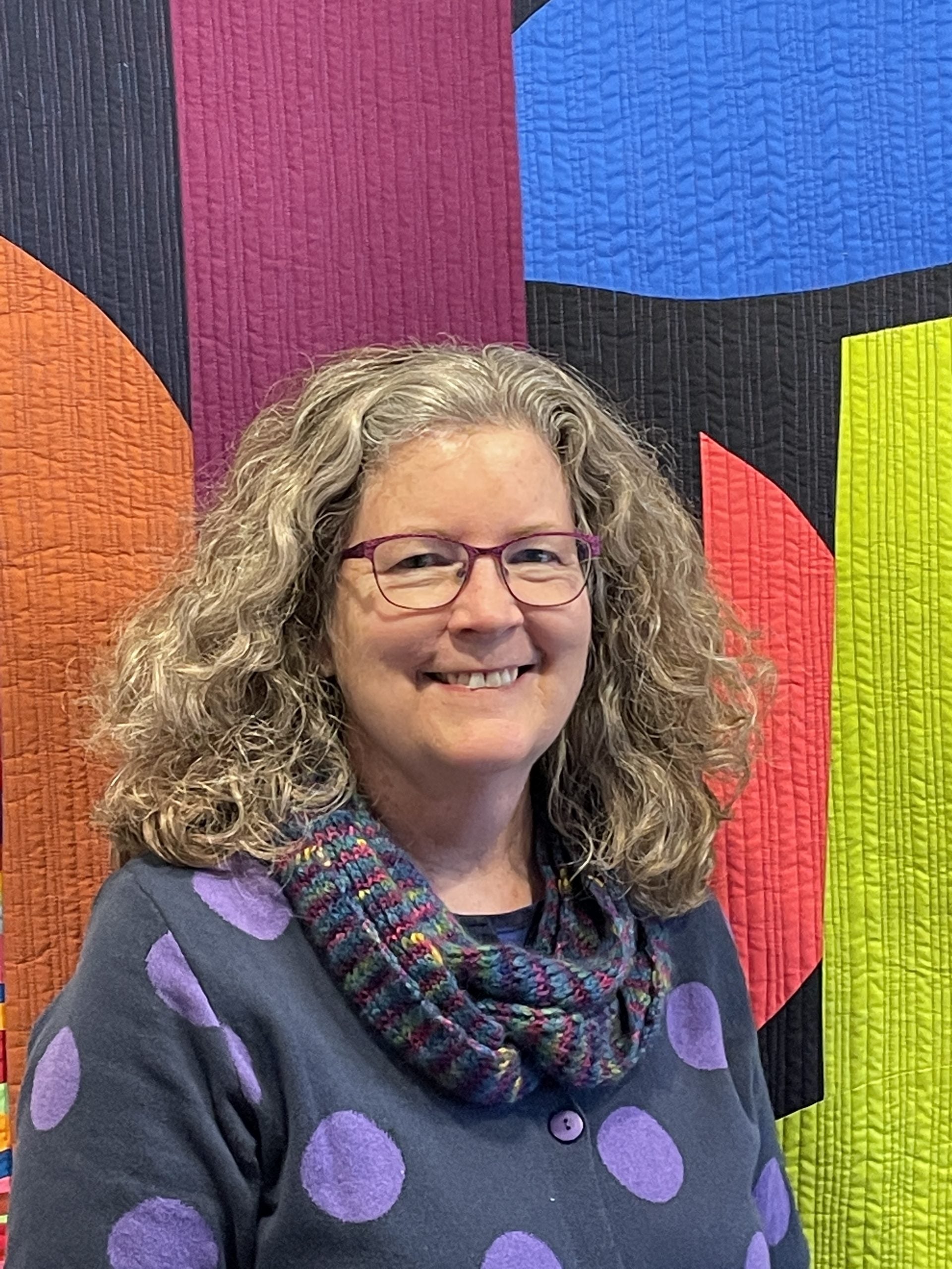 Cindy creates abstract designs in fabric with a focus on color and line. Her work is designed iimprovisationally without a preconceived pattern, a little bit like jazz music, where each decision about color and shape influences the next.
