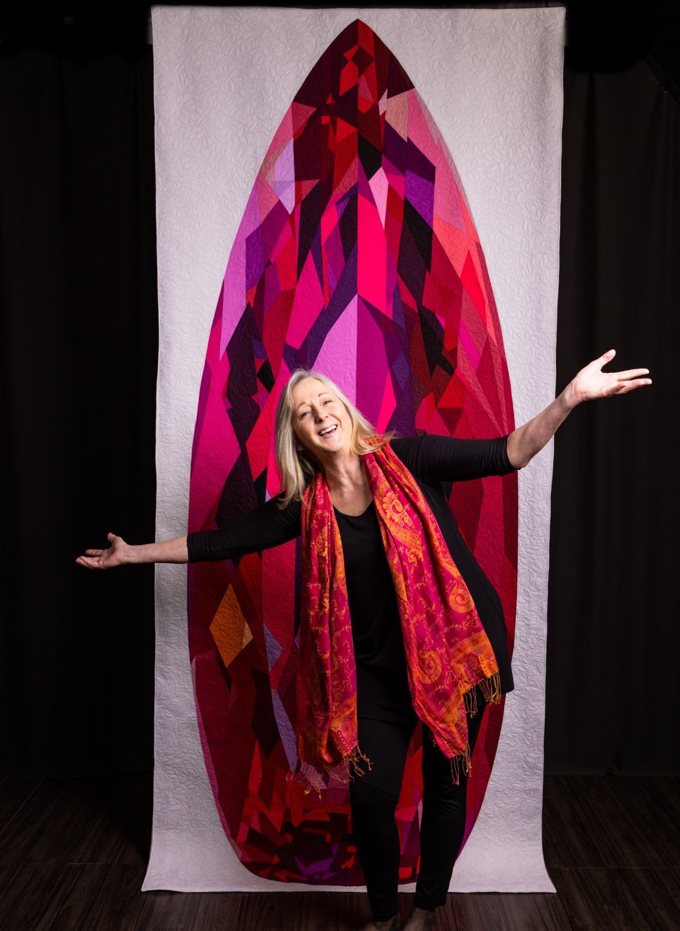 MJ’s work has been exhibited at the National Quilt Museum, the International Quilt Museum, the New England Quilt Museum, Quilt Festival (Houston, TX), Quilt Week (Paducah, KY), and Festival of Quilts (Birmingham, UK). Most recently, MJ’s piece “Torch Song” was exhibited at the Art Quilt Elements 2024 Biennial (Wayne, PA), where she received the Cindy Friedman Master Award for Excellence.