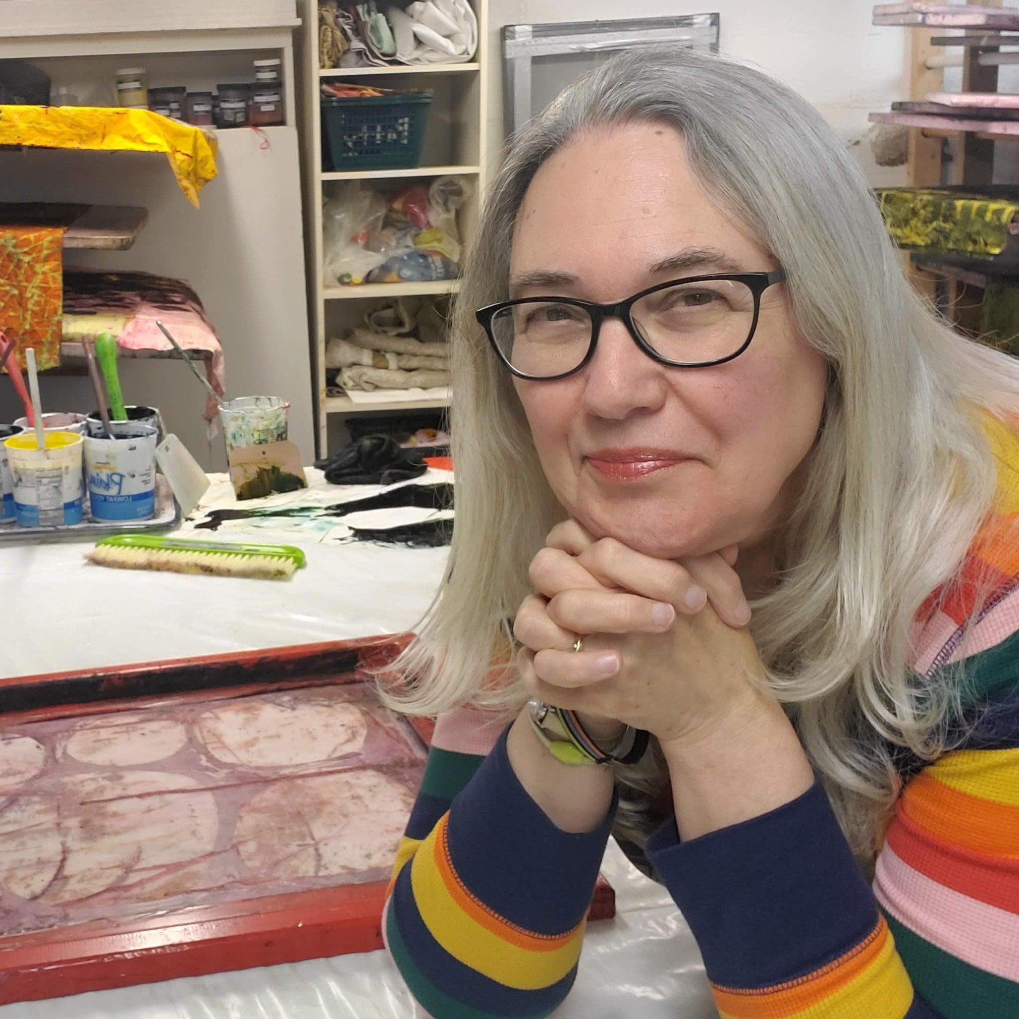 With a graphic, color-saturated palette using her hand-printed fabric, Pat Pauly’s fiber art is seen around the world. Her textile work, which began in the early 1980s, and was first accepted in Quilt National ’83, and has continued to be seen in major exhibitions. Her fiber art’s distinction uses strong abstracted natural forms and complex color combinations. Her work is in both private and public collections.